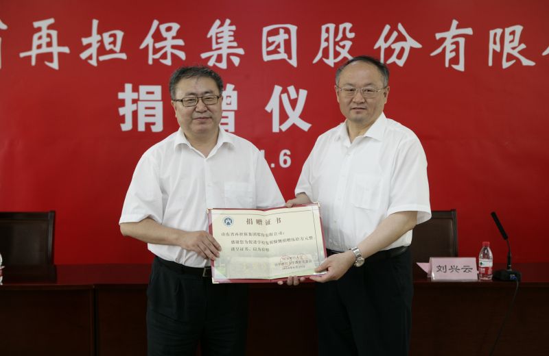 2014年6月26日,山东省再担保集团股份有限公司捐赠仪式在燕山校区隆重举行。再担保集团董事长、我校杰出校友安郁杰,监事会主席赵建国、总经理王葆奎、党委副书记黄利、办公室主任王诗伟、办公室陈克强,校党委书记、校长刘兴云,副校长胡文波出席了仪式,学校党委办公室、校友办公室、教务处、学生处、团委等部门负责人及部门学生代表参加了仪式。仪式由党委副书记、纪委书记牟思伦主持。