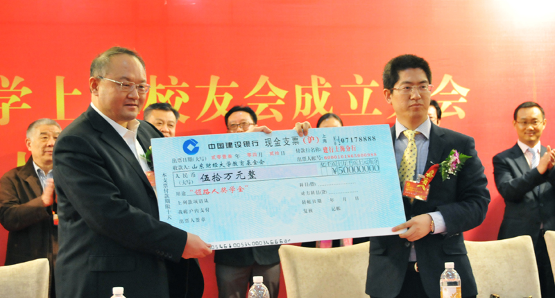 2012年4月20日,在山东财经大学上海校友会成立之际,2001级校友上海领路人照明工程有限公司朱上民董事长为母校捐助50万元设立“领路人奖学金”,助力学校发展建设。校长刘兴云、资深校友中国建设银行上海分行行长王江以及学校党委办公室、校友办公室、山东财政职工大学负责同志、上海校友会会长郭晓天、上海领路人照明工程有限公司部分高管等与260名校友出席了捐赠仪式。校长刘兴云代表学校接受捐款,并为朱上民校友颁发捐赠证书。