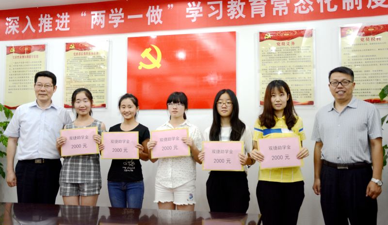李玉成、于栋为受助学生发放助学金。