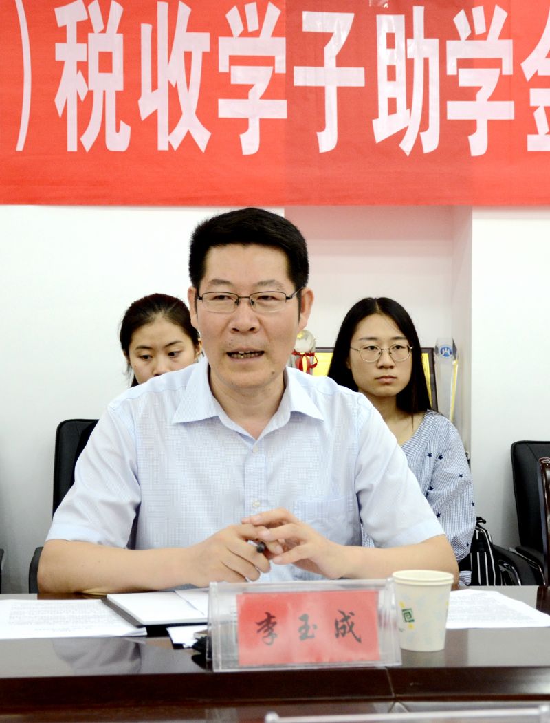 财政税务学院党委书记李玉成首先代表学院向91级校友石玉宝先生多年以来对母校以及学院的关爱表示感谢,对获得助学金的十位同学表示祝贺,并提出四点希望。一是要求同学们坚定理想信念,锤炼高尚品格,有理想、有担当,立志报效祖国,服务人民。二是希望同学们一定要把个人利益与国家民族利益紧密结合在一起,树立家国天下情怀,学会感恩,学会奉献,回报社会。三是要求同学们要学习优秀校友“功崇惟志,业广惟勤”的精神,传递优秀校友的正能量,努力学习,奋发成才。四是要求同学们崇德修身,继承发扬中华民族传统美德,准确理解把握中国传统文化“八德”的时代内涵,以石玉宝校友为榜样,从身边的小事做起,加强道德修养,注重道德实践。