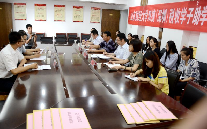 会上,学生工作处副处长于栋宣读了《山东财经大学双捷(深圳)税收学子助学金管理办法》以及受助学生名单。